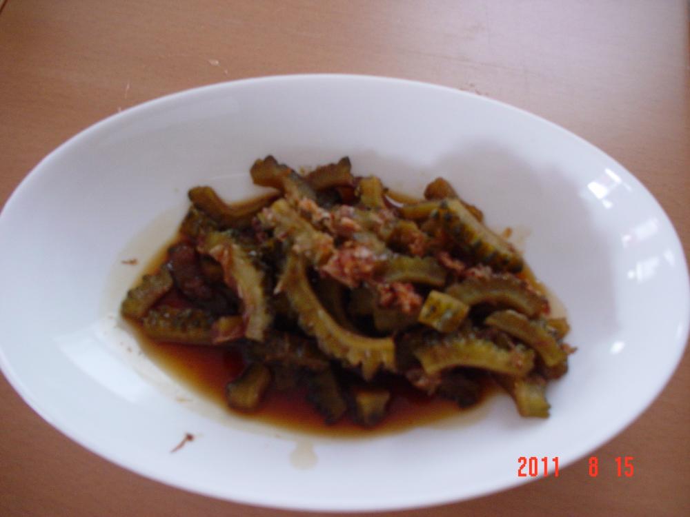 ![]() ラカントS液状、米酢、しょうゆを煮立たせた鍋に、塩もみし洗ったゴーヤ(縦半分に切ったものを1cm厚さに切る)を入れる。