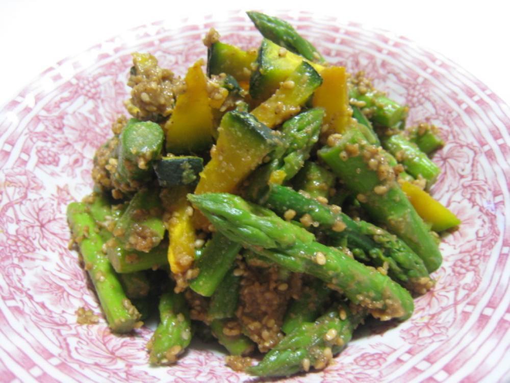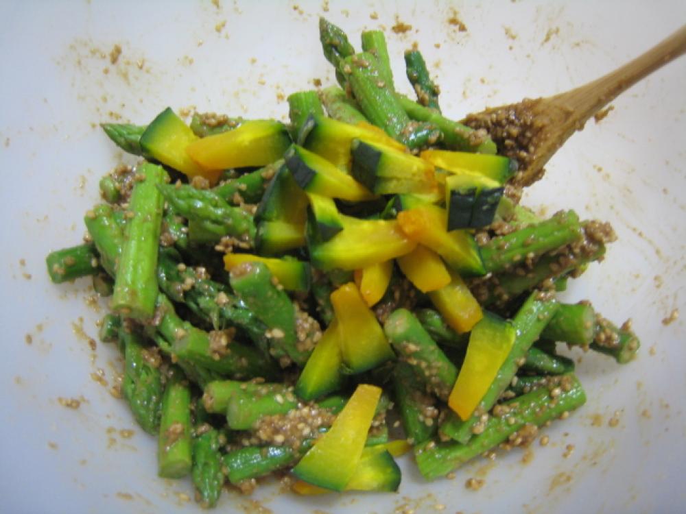 ![]() かぼちゃはレンジでチンして、アスパラと一緒にゴマだれで合える