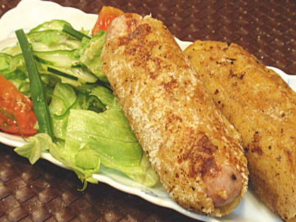 ボイルしたソーセージに4の生地を巻きつけ、その上から細かめのパン粉を薄くまぶし、