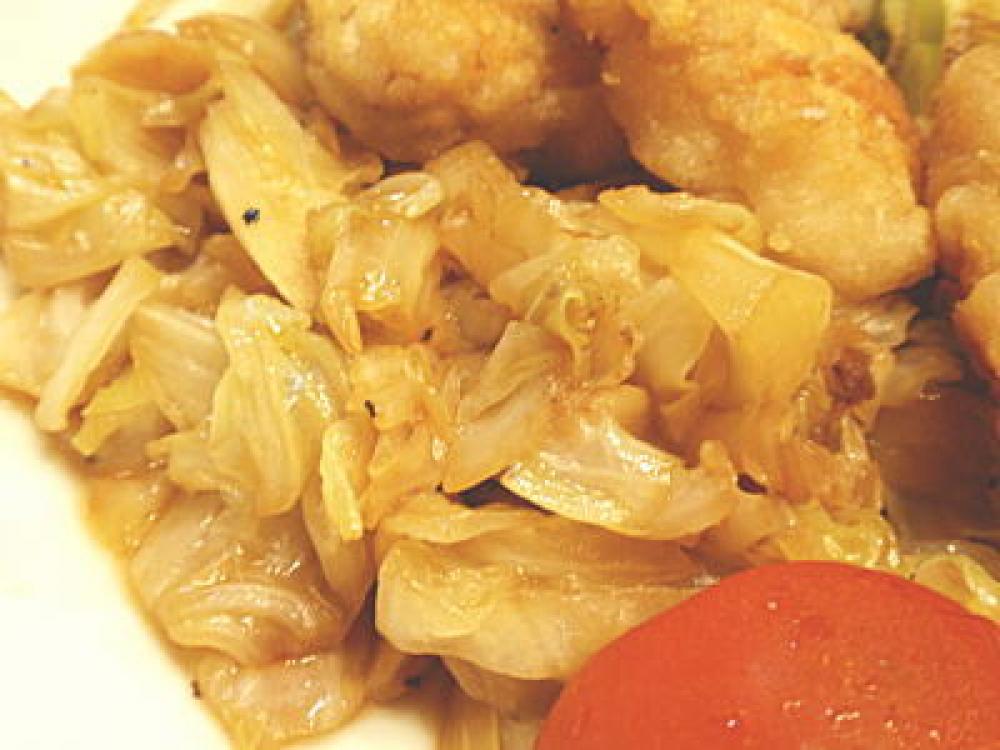 塩・胡椒をしたら蓋をして、キャベツの量が半分くらいになるまで弱火で蒸し煮にします。