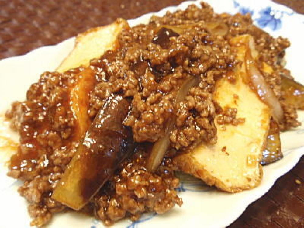茄子、玉ねぎ、厚揚げの順に加えて炒め、ほぼ火が通ったら、水と酒(分量外)を各大さじ1~2くらいずつ加えて軽く煮ます。