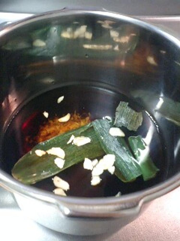 ![]() 圧力鍋に、焼いた肉と肉以外の調味料等を全て入れる