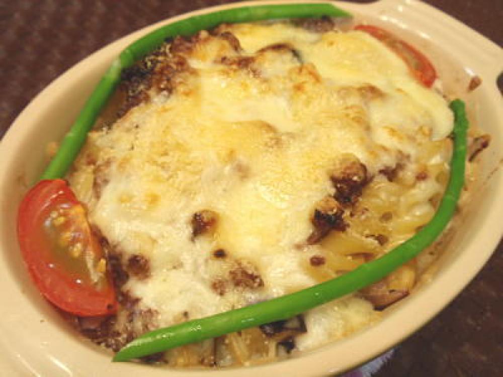 煮汁が少なくなってきたら、茹でたマカロニを加えてひと混ぜし、オーブン皿に盛り、ひき肉を上からかけたら、