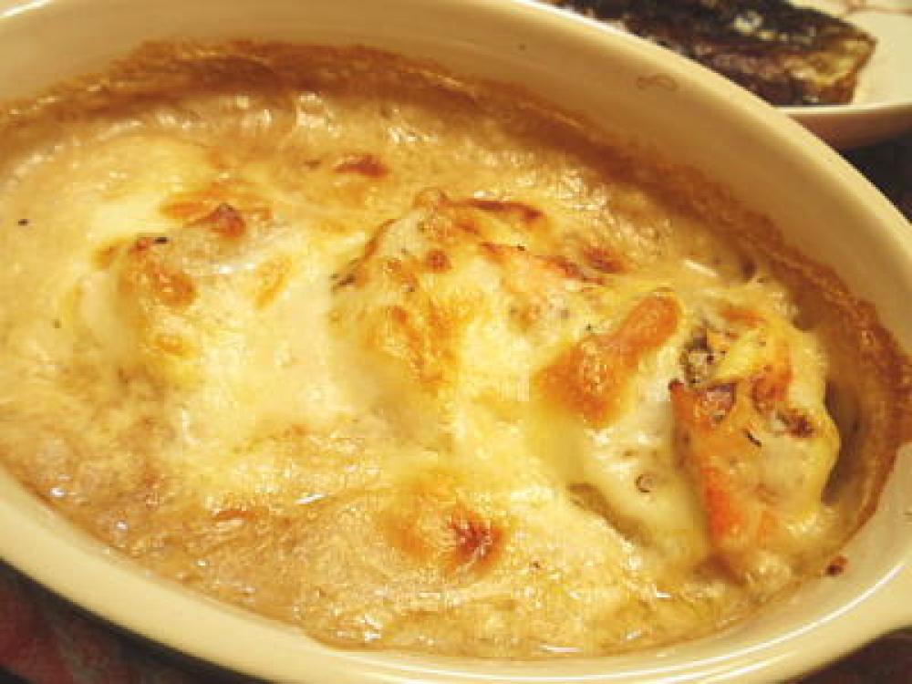 その上から2のグラタンソースを流し入れ、最後にとろけるチーズをかけます。