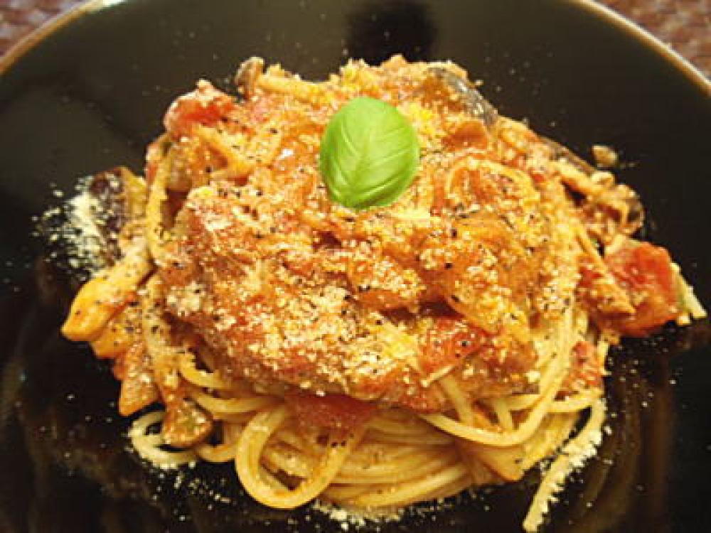 鍋またはフライパンにオリーブ油をしき、ニンニクを加えて弱火で香りを出したら、玉ねぎ、茄子を加えてよく炒めます。