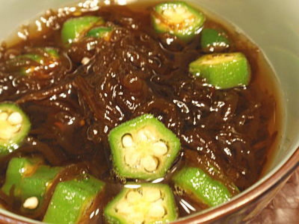 材料-Aを全てよく混ぜたら、もずくとオクラを加えて全体によく混ぜ合わせ、冷蔵庫で冷やします。