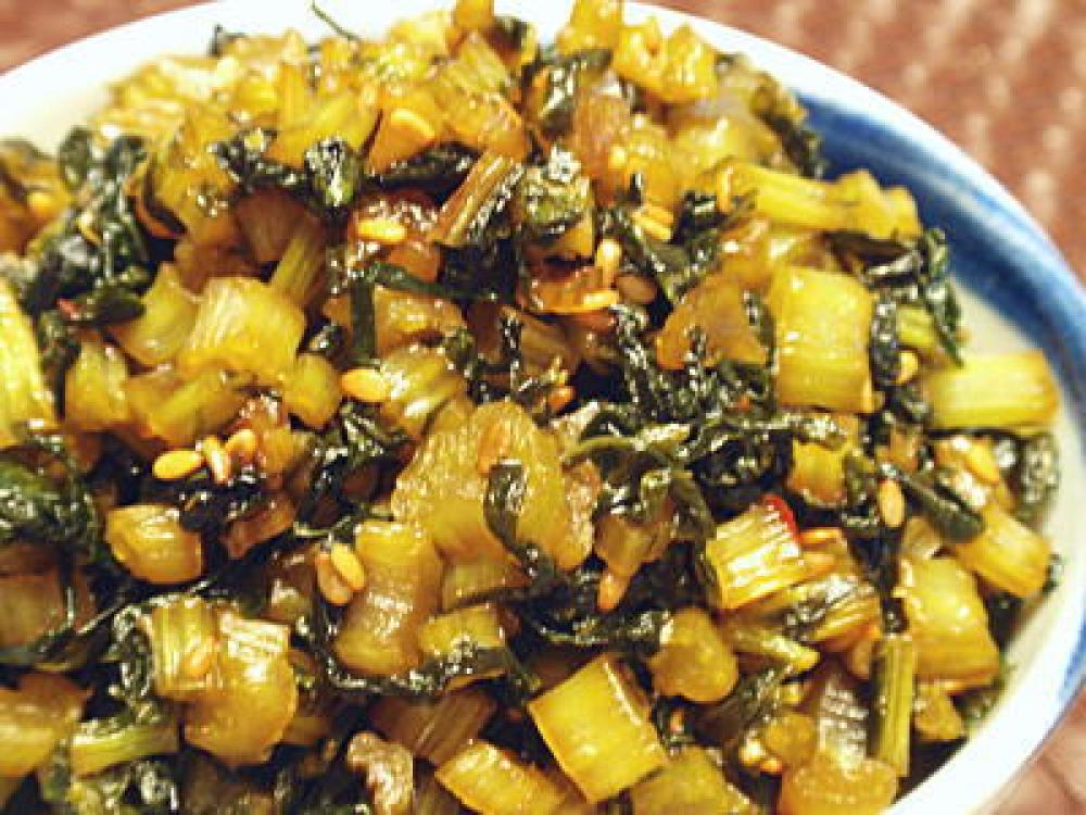塩茹で後に水にさらしてから水気を絞った大根の葉を、サラダ油をしいたフライパンまたは鍋で炒めます。