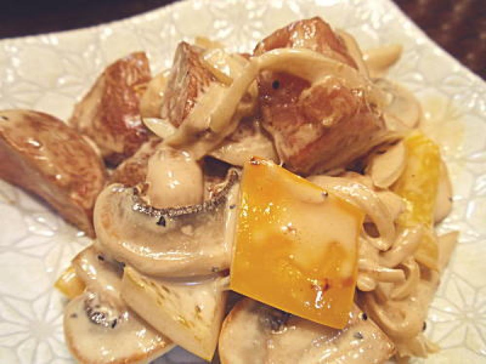 マッシュルームは、食べやすいサイズにカットしたらフライパンで焼き、軽く塩をふったら火をとめて、バターを少量加えて和えます