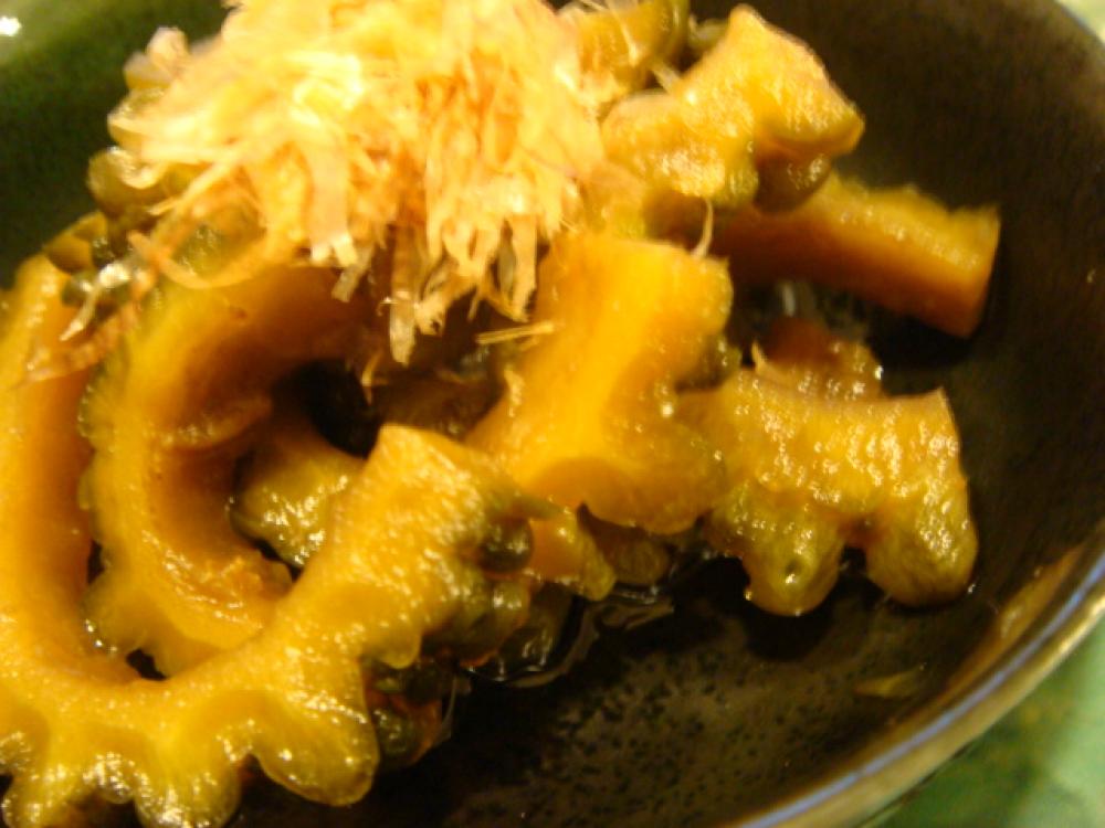 圧力鍋に切ったゴーヤと鷹の爪を入れ、そこにラカントS液状としょうゆ、みりん、だし汁、料理酒をいれ3分ほど強火で煮る