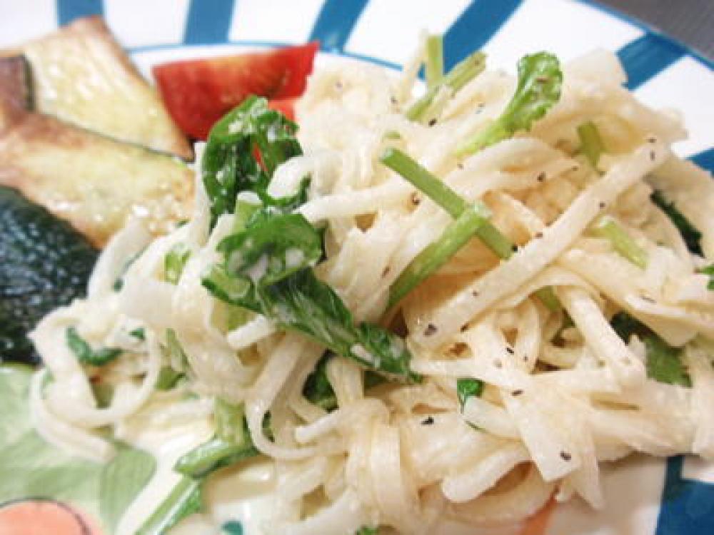 大根は千切りにして塩小さじ1(分量外)をふり、5分以上置いてから水気をよく絞ります。
