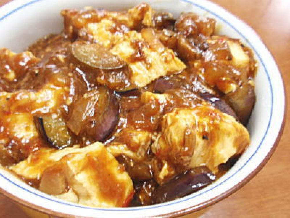 中華鍋にサラダ油(小さじ1~2:分量外)を入れて、玉ねぎと茄子を加えて炒めます。