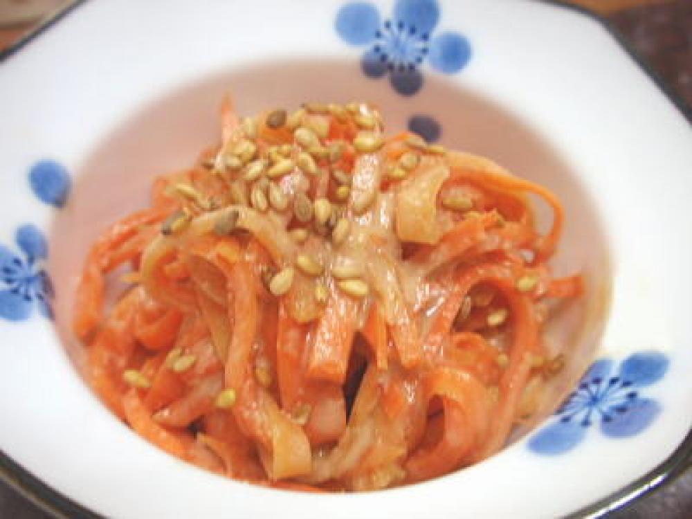 ボウルに練り胡麻・醤油・砂糖を加えてよく混ぜ合わせたら、1の人参を加えて和えます。