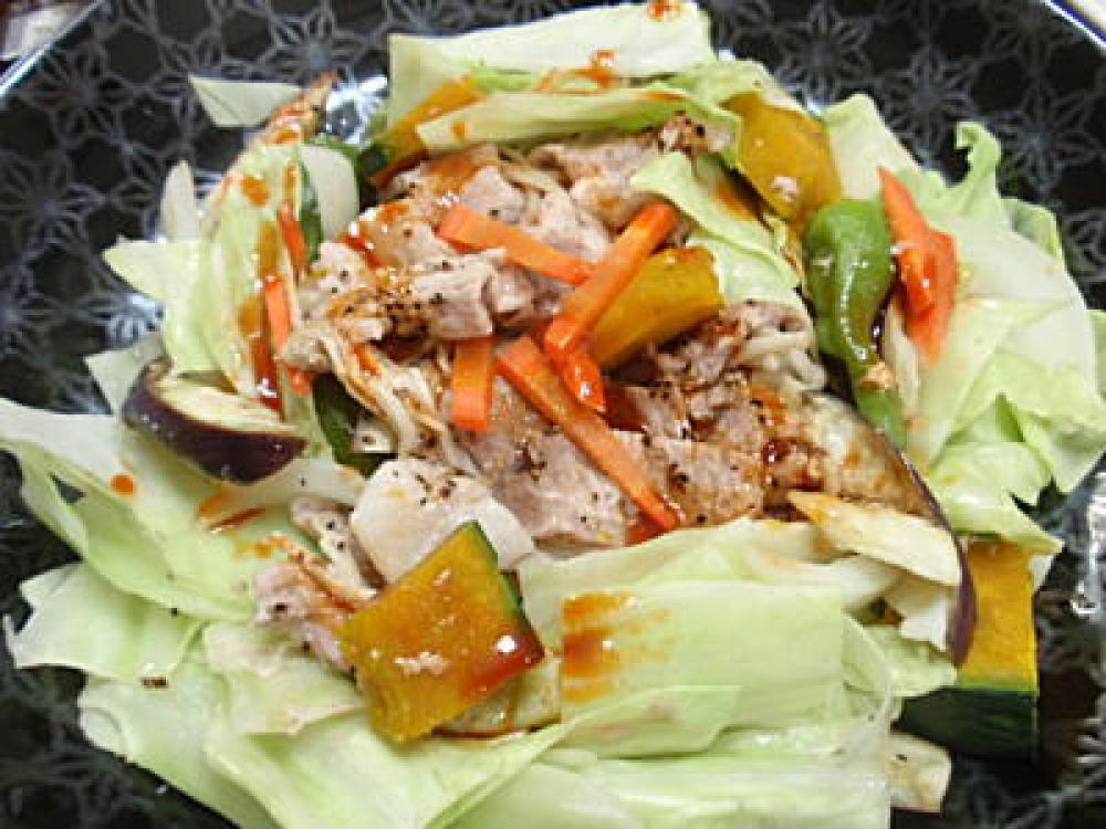 蒸し器で10分強火で蒸したら器に盛り、底に残った野菜の旨み汁をかけます。