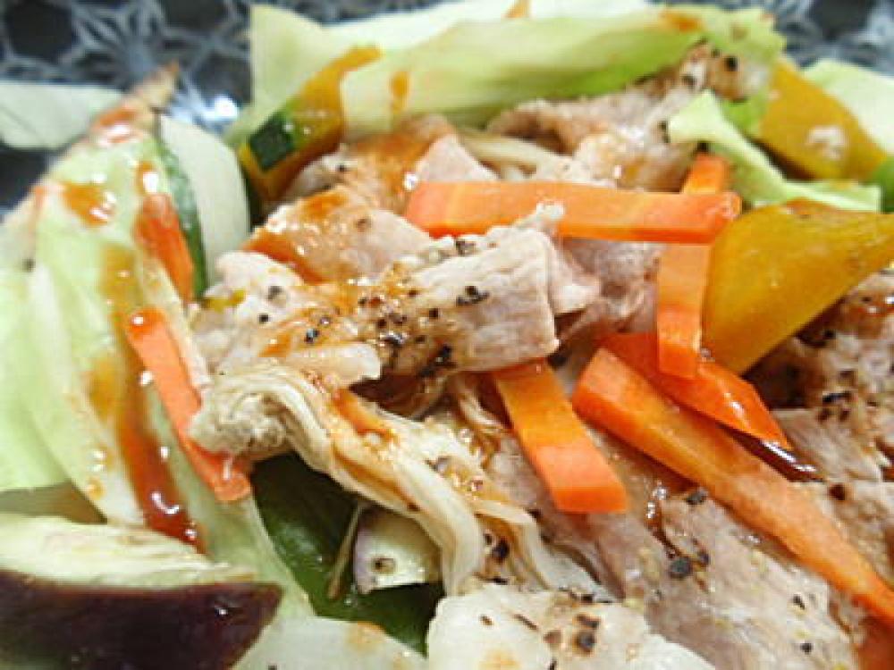 一番上に5センチほどの長さにカットした豚肉を並べ、塩・胡椒をふります。