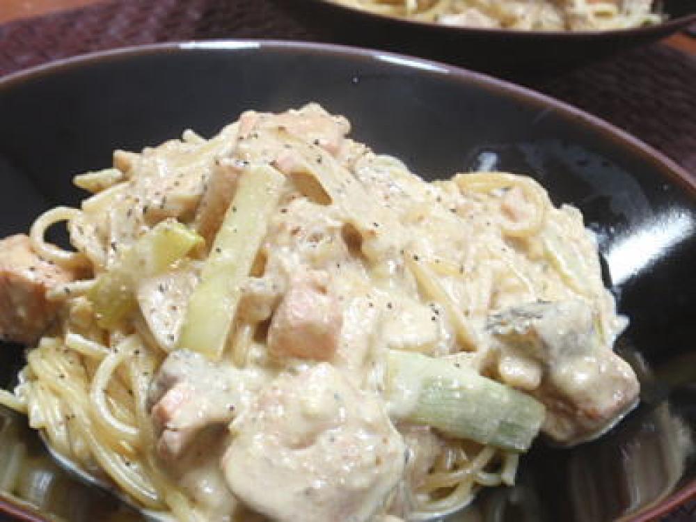 茹であがったパスタを加えてひと混ぜしたら、よく溶き混ぜておいた材料-Aを加えて火を止め、予熱で全体によく絡めます。