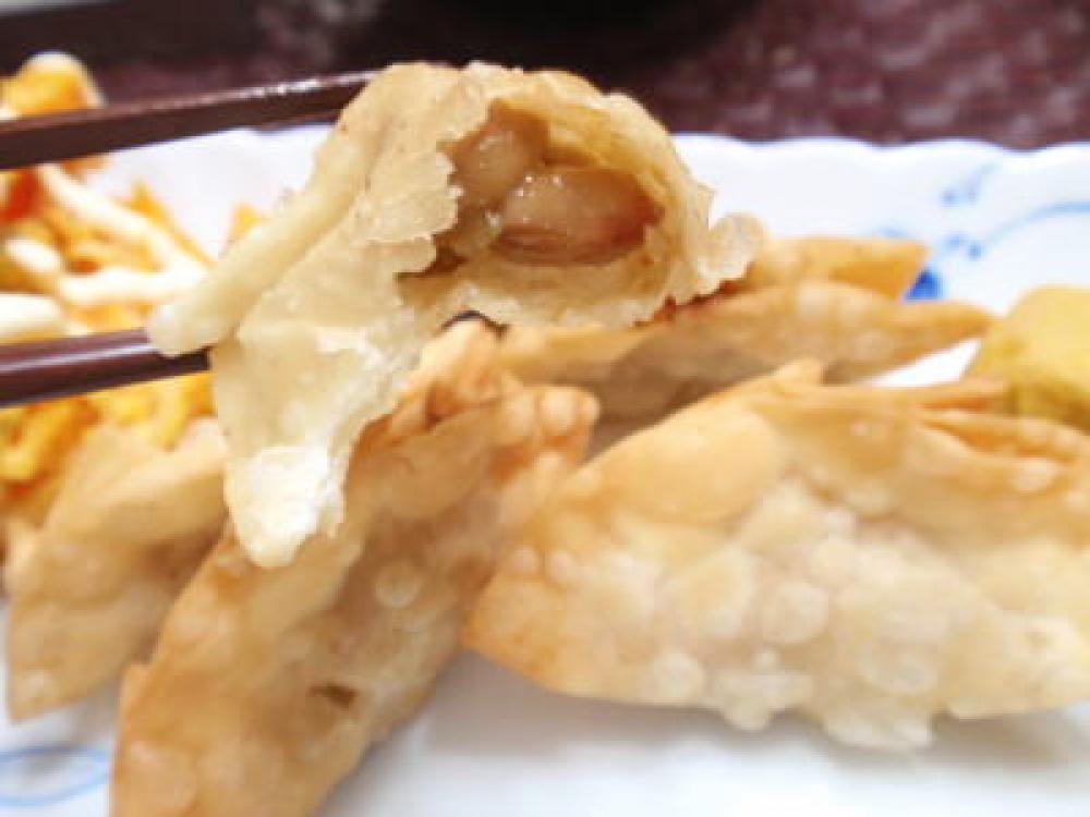 餃子の皮の縁を水で濡らし、中央に1を少量のせて包んだら、油でこんがりきつね色に揚げれば完成です。