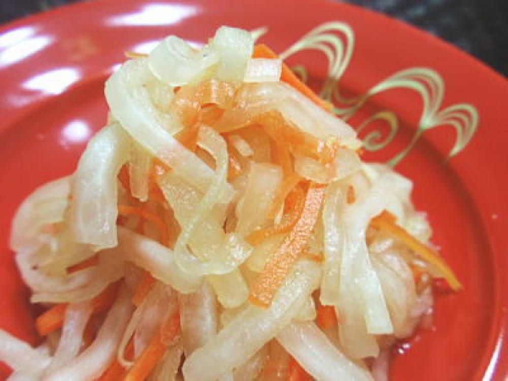 大根と人参は長さを揃えて千切りにし、塩をふって5~10分ほど置いてから水気をよく絞っておきます。