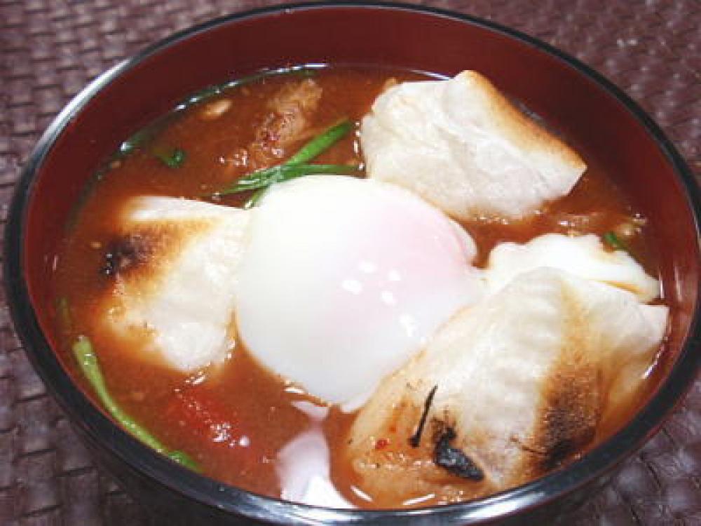 器に盛り、中央に温泉卵をのせ、まわりに1の切り餅を並べれば完成です。
