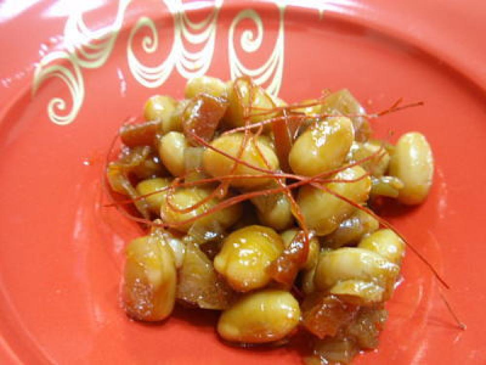 火が通ってきたら、大豆水煮と材料-Aを加えて炒めます。