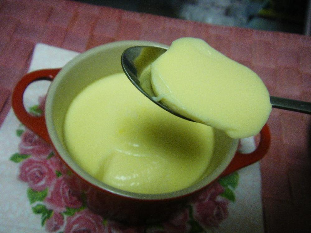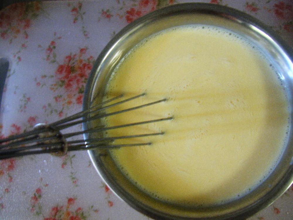 ![]() 1で加熱後、よくかき混ぜて、よく溶きほぐした卵とバニラエッセンス少々加えます。このとき、泡立てないように静かにまぜます。