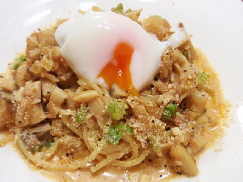 1のパスタと、レンジなどで温めた牛乳を加えて全体によく混ぜ合わせたら器に盛り、お好みで材料-Dをふり、