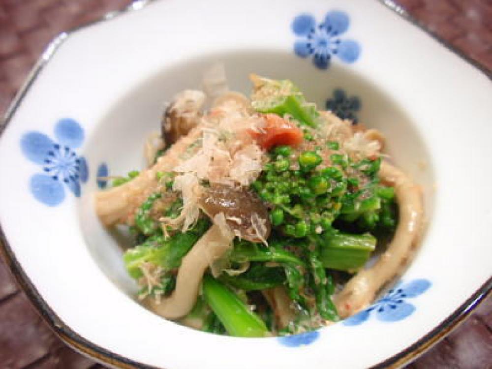 菜の花は3~4センチに切り揃えて塩茹でし、流水にさらしてから水気を絞っておきます。