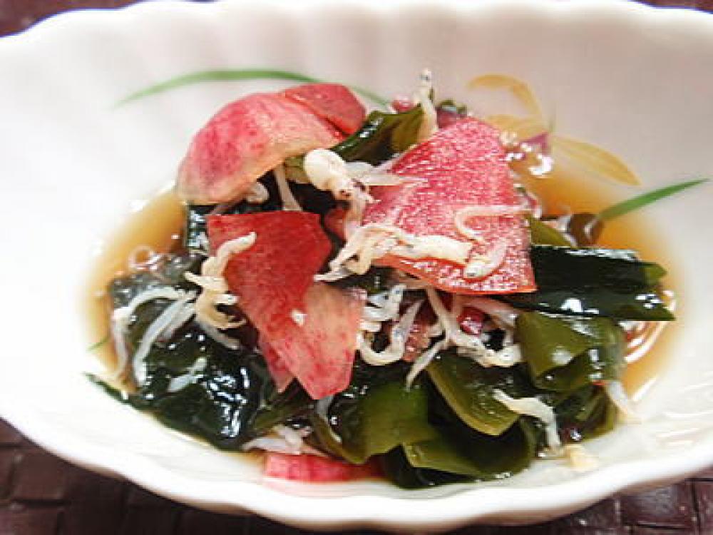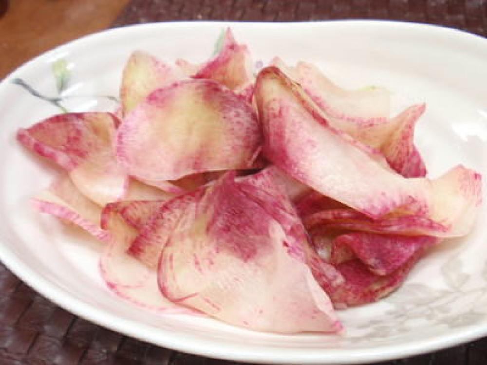 ![]() 赤大根の即席漬です。食べやすいサイズにスライスした大根に塩をふって10分ほど置き、水気をしっかり絞れば出来上がりです。
