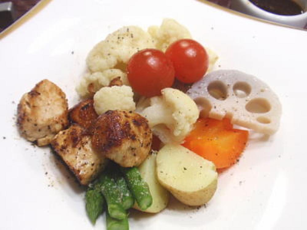 1と2を器に盛り、ミニトマトを飾ったら、野菜に塩・胡椒を軽くふり、材料-Bをよく合わせてかければ完成です。