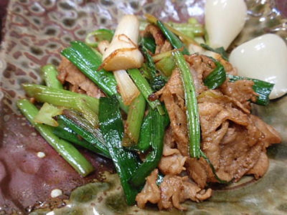 3~5センチの長さにカットしたにんにくの葉を加えて炒め、塩・胡椒で味を調えます。