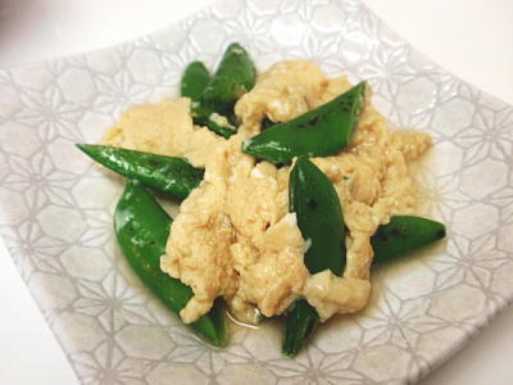 熱したフライパンにサラダ油(分量外:小さじ1/2程度)をしき、半分にカットしたスナップえんどうを軽く焼きます。