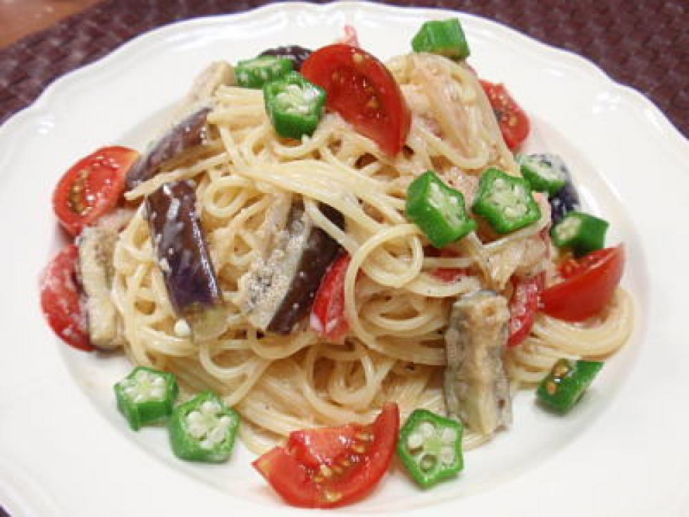 オクラはパスタを取り出した茹で汁で30秒~1分ほど茹でてから、氷水でよく冷やし、5ミリ幅にカットしておきます。