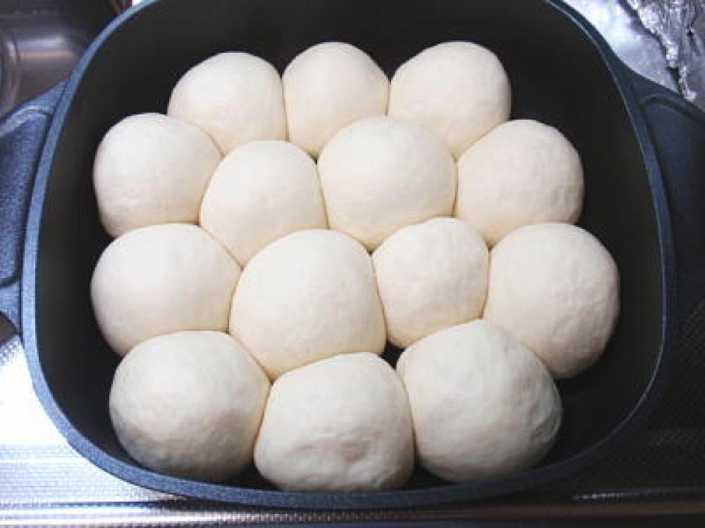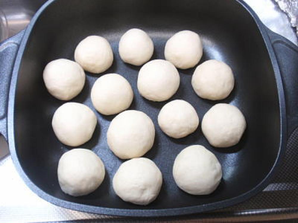 ![]() 一度生地を潰し、12~15等分にしたら、生地をそれぞれ丸めて鍋に並べます。フタをして、再び1時間ほど放置します。