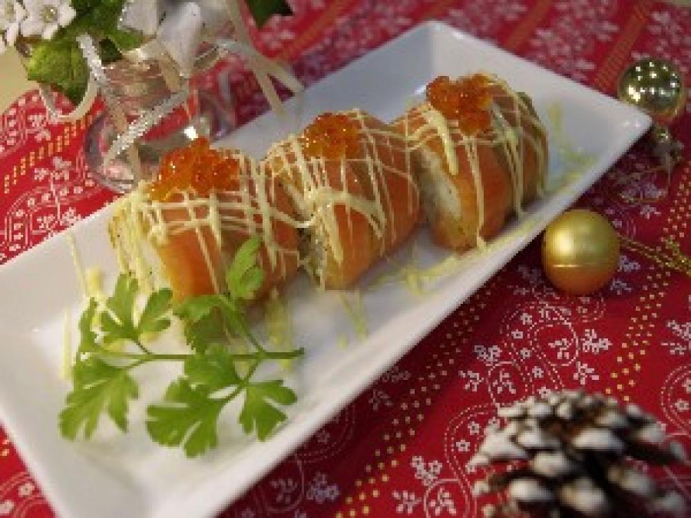 スモークサーモンを巻きすの上にラップを敷いた上に広げ、その上に(4)の酢飯を棒状にのせて巻く。