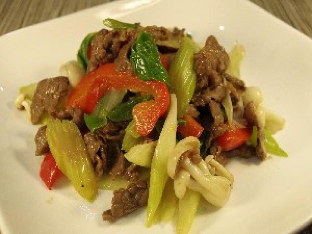 フライパンに牛肉、セロリ、長ねぎ、しめじ、パプリカの順でよく炒める。