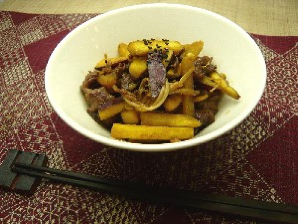 牛肉はさつまいもに合わせて食べやすい大きさに切る。