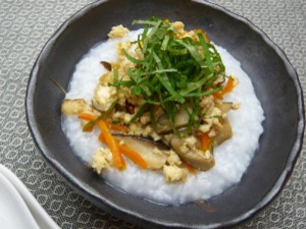 温かいおかゆに(5)をのせ、最後に大葉を盛ってできあがり。