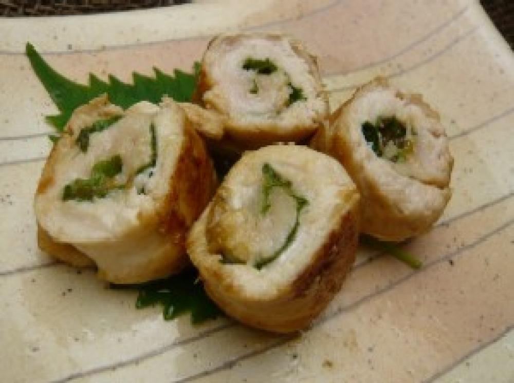ささ身に(2)を全体にぬり、大葉をのせて巻く。巻き終わりを爪楊枝でとめる。