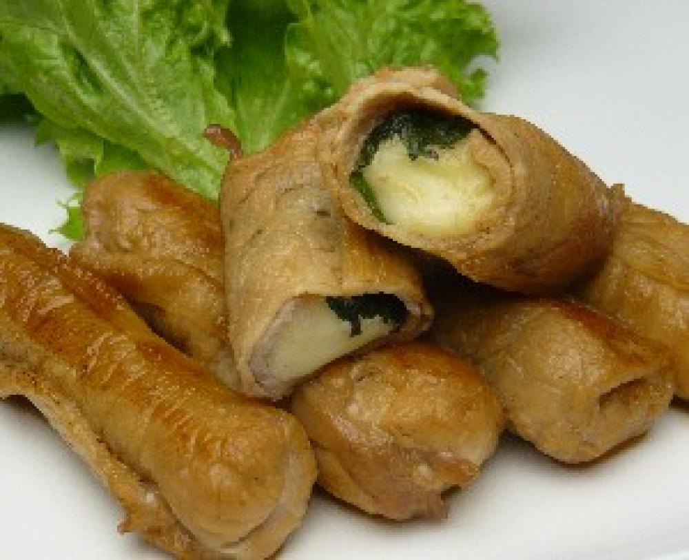 大葉とチーズスティックを半分に切り8個分にし、豚肉の上に大葉、チーズスティックの順でおいて、くるくると巻く。
