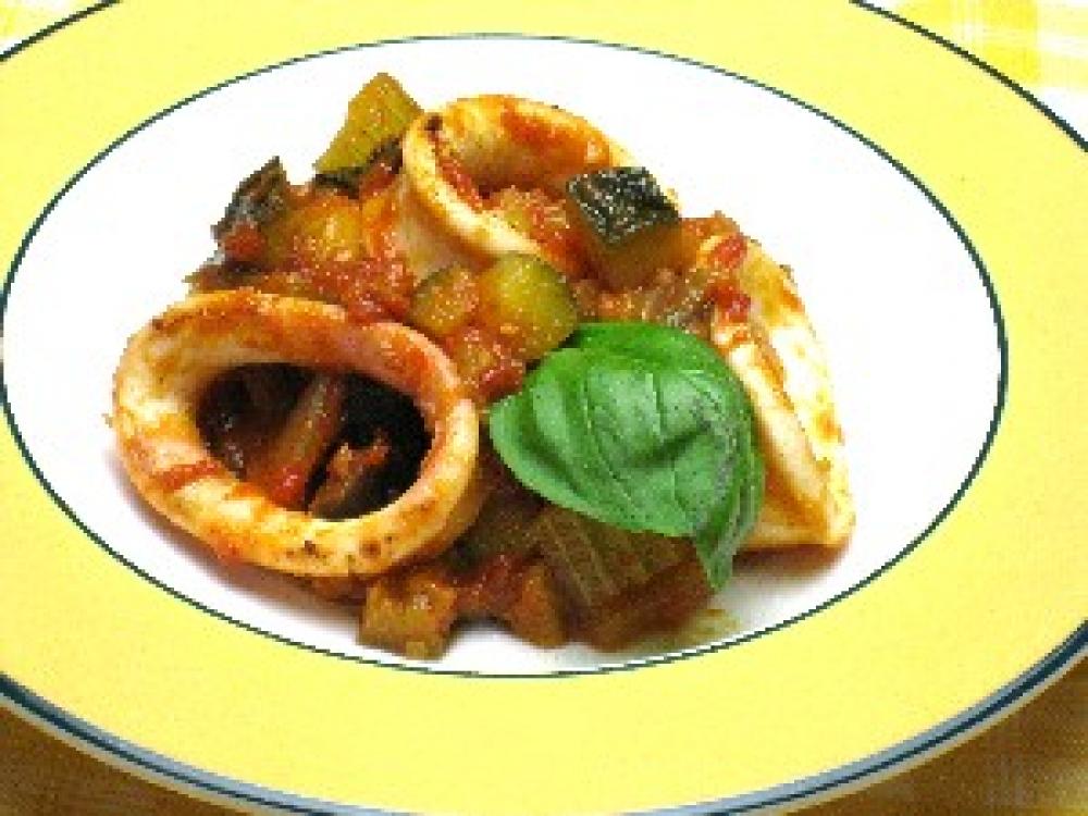 いかが色よく焼けたら、ラタトゥイユの鍋に加えて、ひと煮立ちさせて、さっとあわせる。