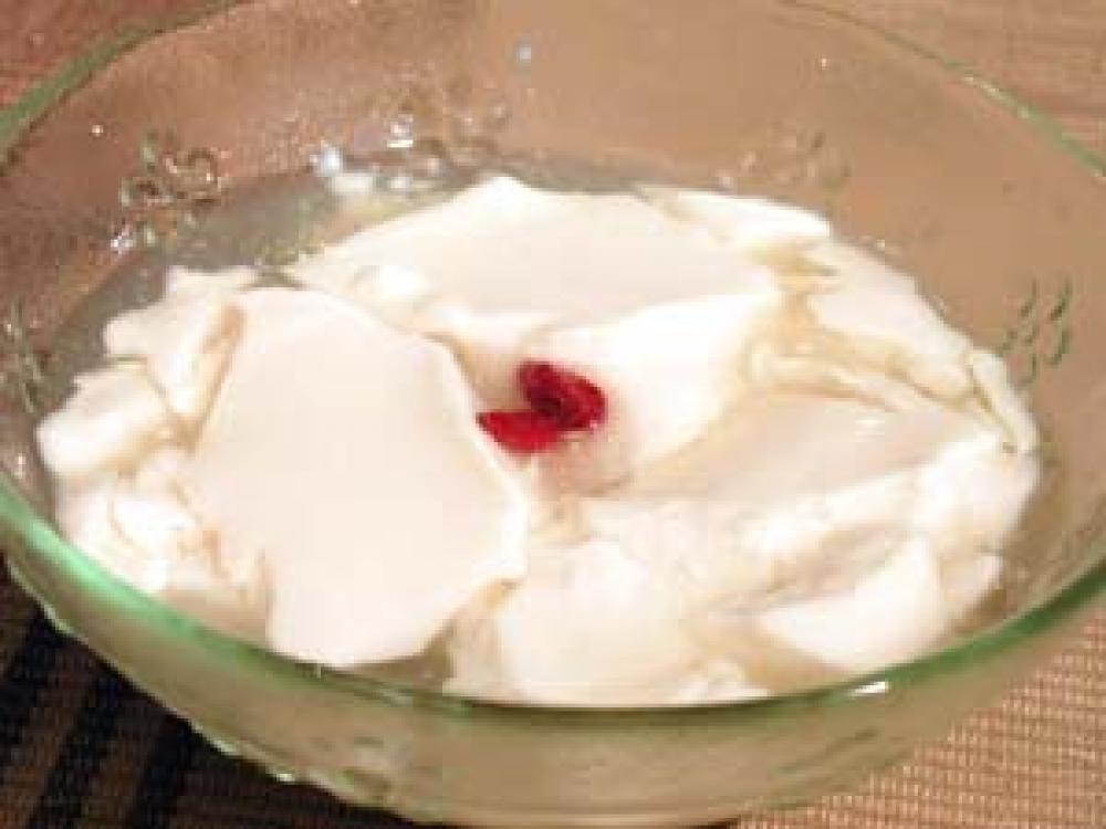 豆花が固まったら、レンゲや大きめのスプーンですくって、器に盛り、シロップをかけて、お好みでクコの実を散す。