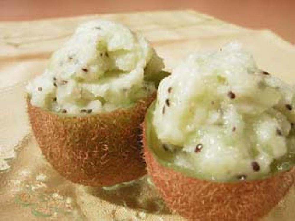 くり抜いた、キウイの皮を器にして、シャーベットを盛り付ける。