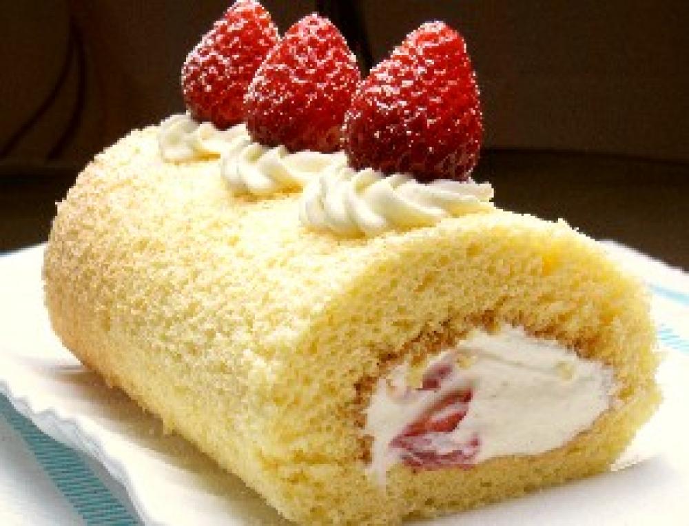 休ませたロールケーキをだし、上にいちごを飾り、お好みで粉糖をかければ出来上がり。