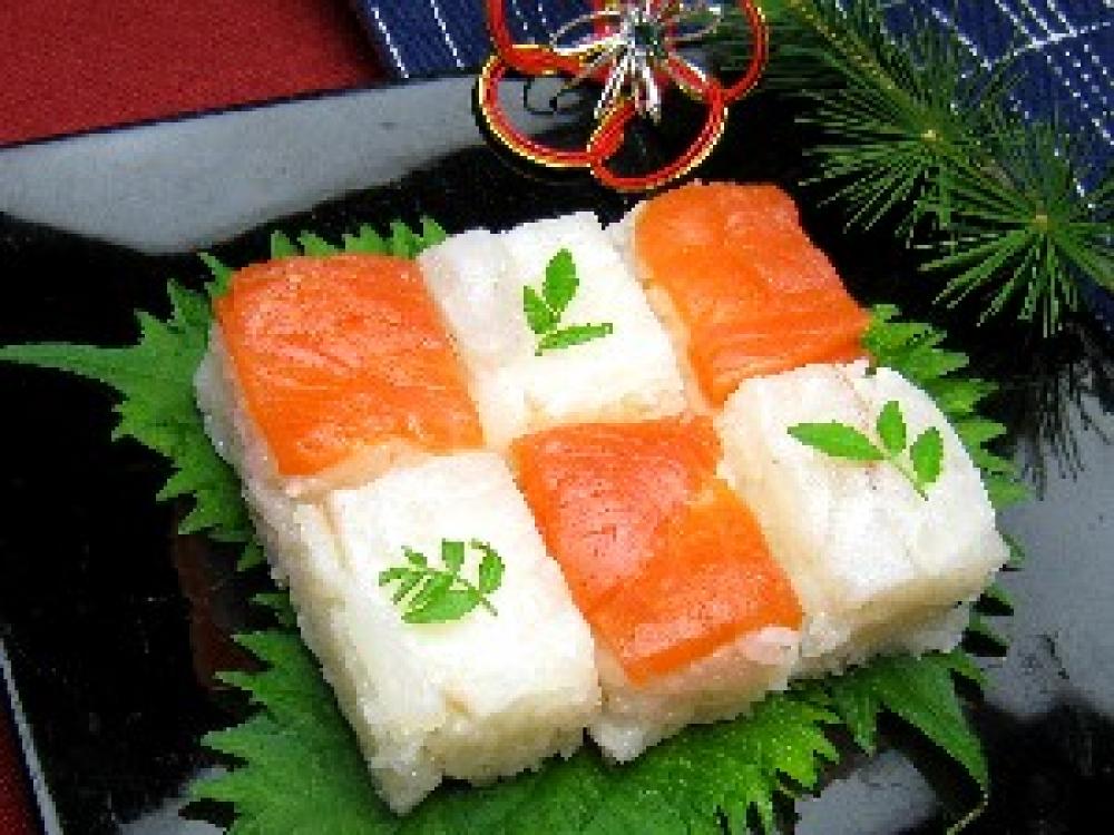 ごはんを2等分にし、それぞれ角型に寿司飯を詰めてスモークサーモンと、鯛を乗せる。