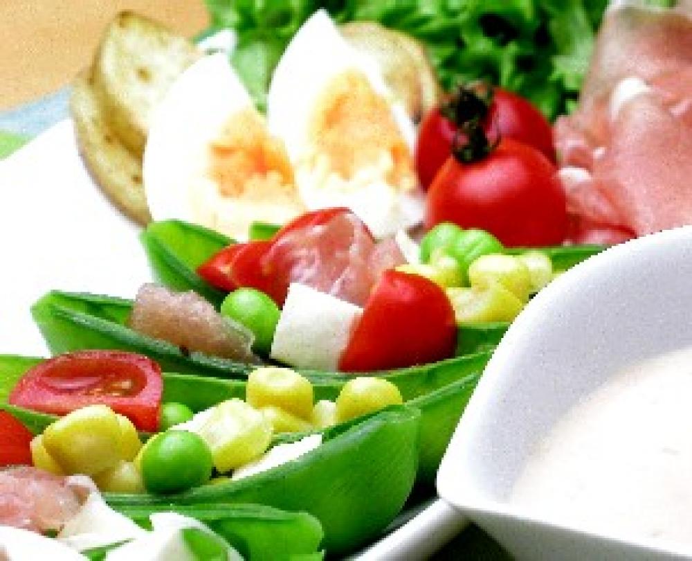 茹でたスナップエンドウを開き、中にプチトマト、モッツァレラチーズ、コーン、生ハムなどすきな具材を入れる。