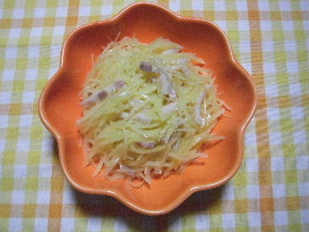 ![]() じゃが芋は、皮を剥き、2~3mmの千切りにする。(切ったじゃが芋は、赤くなるのを防ぐため、水にさらす)