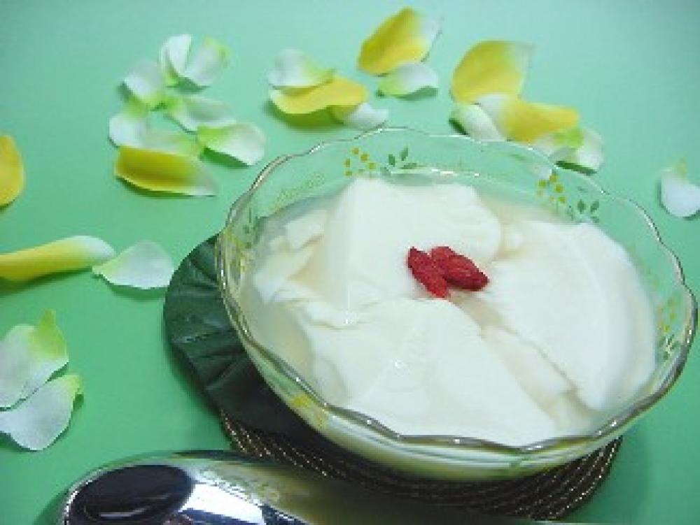 豆花が固まったら、レンゲや大きめのスプーンですくって、器に盛り、シロップをかけて、お好みでクコの実を散らす。