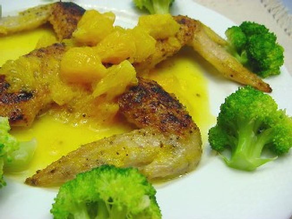 器に鶏肉と、ソースをたっぷりと盛り付け、ブロッコリーを添えてできあがり。