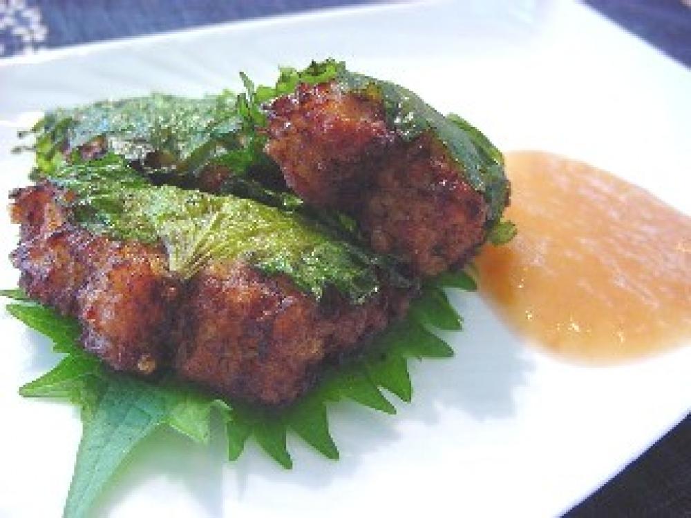 食べやすい大きさにまとめ、シソではさみ、油であげる。