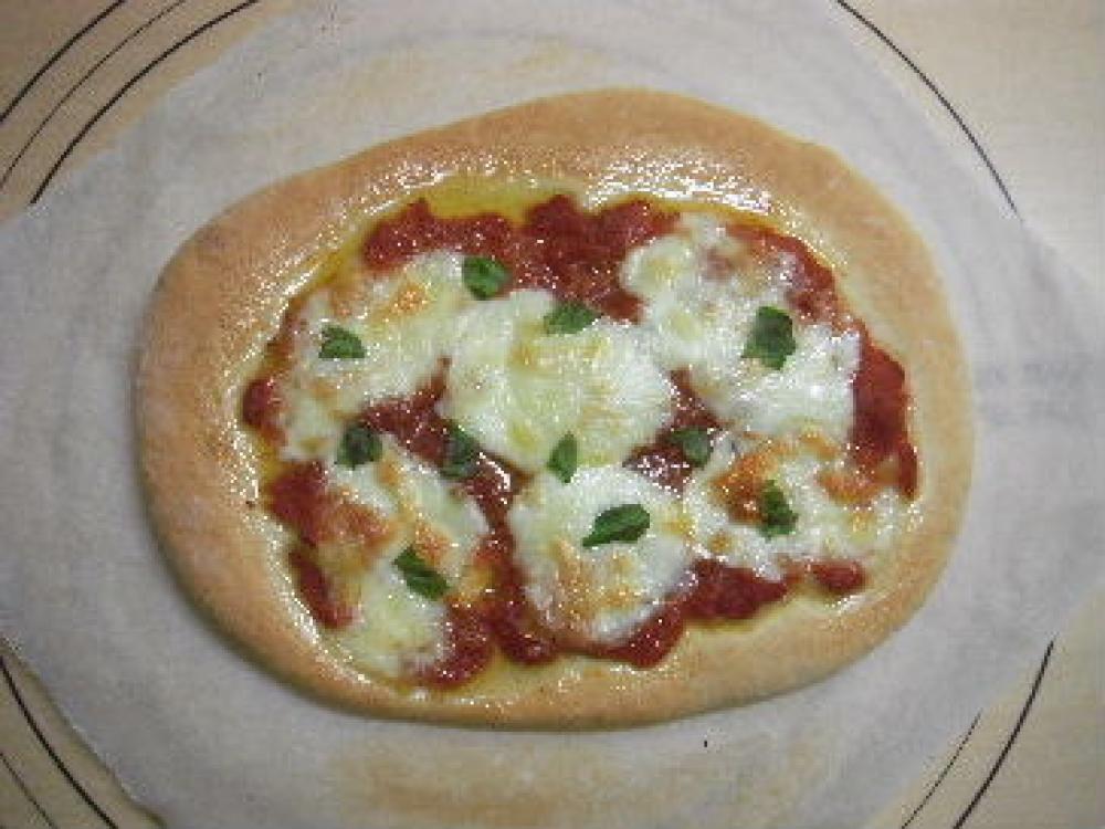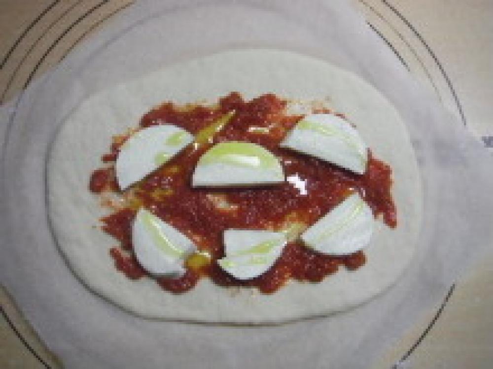 成形。生地を薄く伸ばし、トマトソース、モッツァレラチーズ、パルメザンチーズ、オリーブオイルをトッピングする。