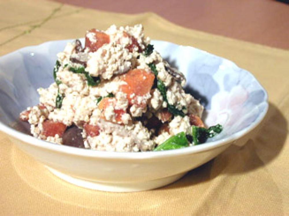 豆腐は手で適当にくずしてキッチンペーパーを敷いた皿にのせ、電子レンジで加熱した後、しっかり水気をとる。